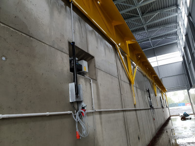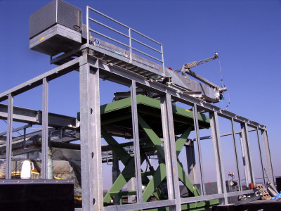 Elektrohydraulisch höhenverstellbares Geländer mit Schüttrampe in einer Deponie. Die Segmente lassen sich einzeln in 10 m Stücken absenken oder ausfahren. |
